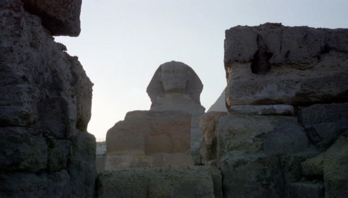 Südlich der Großen Pyramide in der Nähe des Khafre-Taltempels liegt die Große Sphinx. Die aus Kalkstein geschnitzte Sphinx hat die Gesichtszüge eines Mannes, aber den Körper eines liegenden Löwen; Sie ist ungefähr 73 Meter lang und 20 Meter hoch. Die Sphinx ist ein wichtiges Bild in der ägyptischen und griechischen Kunst und Legende. Das Wort Sphinx wurde von griechischen Grammatikern vom Verb sphingein („binden“ oder „quetschen“) abgeleitet, aber die Etymologie hat nichts mit der Legende zu tun und ist zweifelhaft. Hesiod, der früheste griechische Autor, der die Kreatur erwähnte, nannte sie Phix.