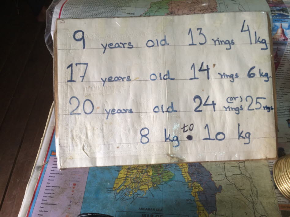 Südwestlich in Myanmar leben die Padaung, eine von 8 Kayah Minderheiten des Kayah Staates. Die vielen Kupferringe lassen die Hälse der Padaung Frauen am Inle See sehr lang werden. Das Tragen der Kupferringe auf dem Hals, an Händen und Füßen sollen sie vor dem bösartigen Tiger beschützt. Mädchen im Alter von 8 Jahren tragen ihren ersten Ring. In jedem Jahr ein weiterer Ring hinzu. Je mehr Kupferringe eine Frau trägt, um so mehr wird sie geachtet.